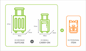 • 中型スーツケース(67×48×27cm)1個または小型機内持ち込み手荷物(55×40×25cm)1個